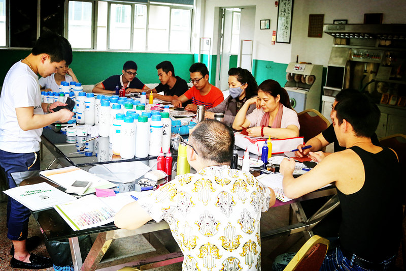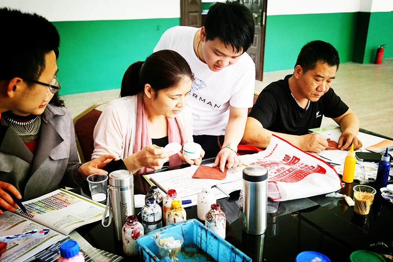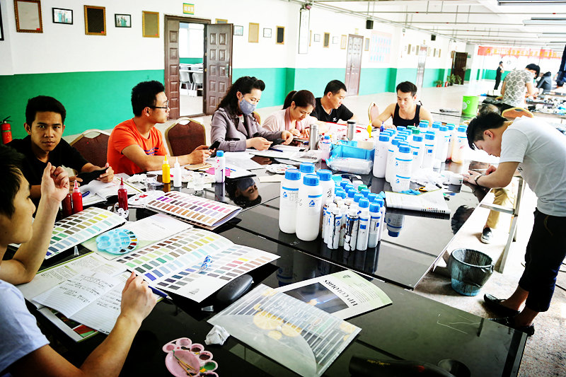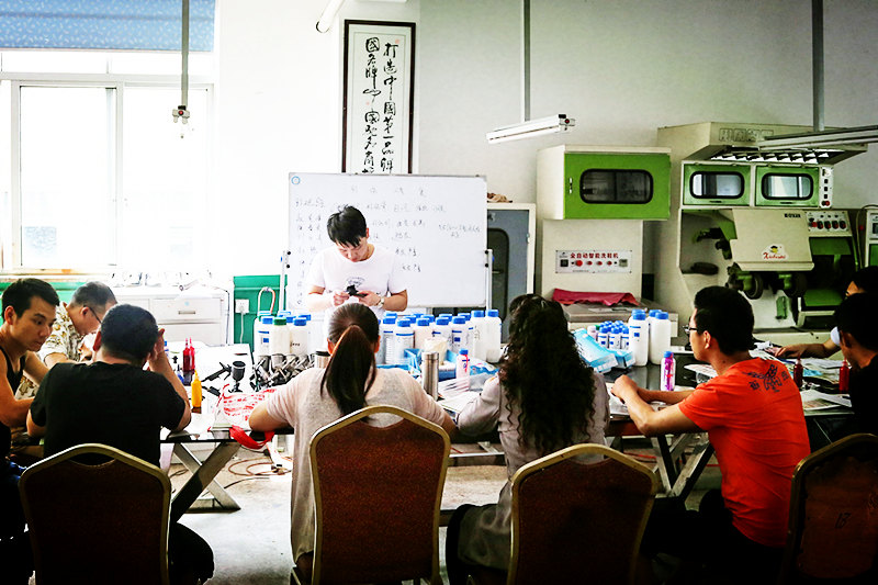 浙江芬尼奇工贸有限公司周老师在给学员制作调色补伤的皮具护理相关的课程实物演练皮质!根据学员情况不一样,给学员不一样难度的皮质和损伤!