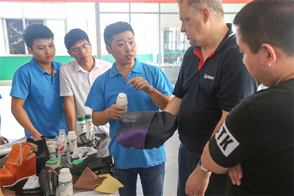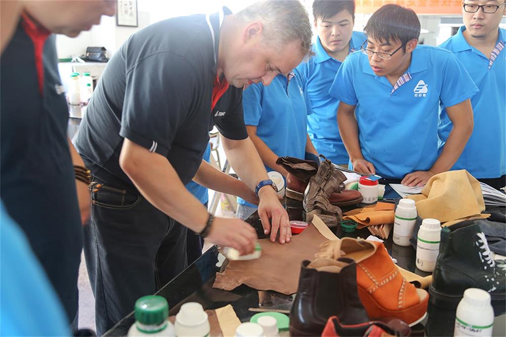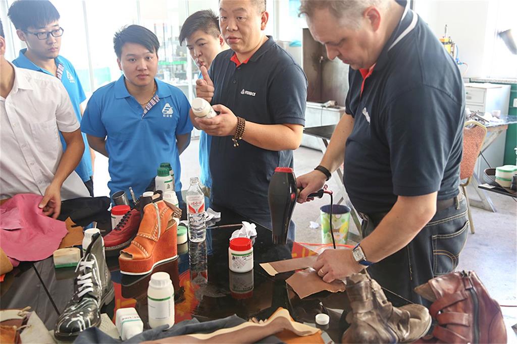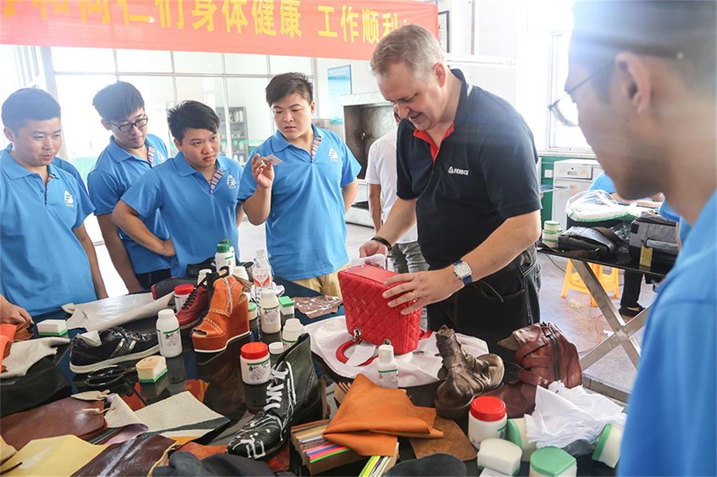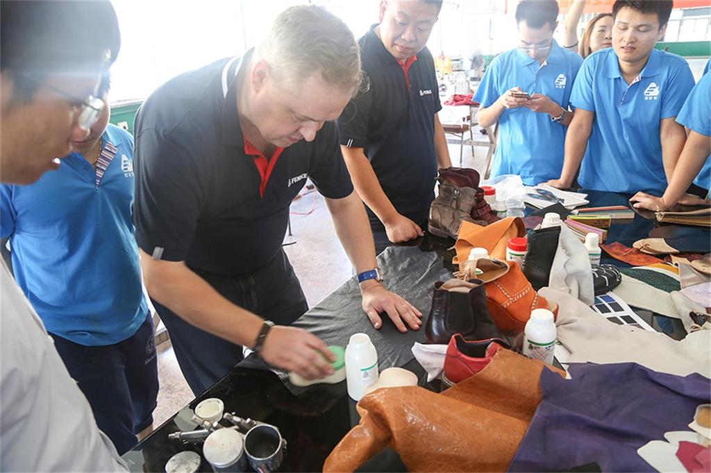 8日上午,由意大利芬尼斯专业皮革化工有限公司,技术总监Andrew(安局)先生率领的皮具修饰护理技术团队一行3人,在温州芬尼斯公司董事长鲍光华的陪同下,对温州芬尼斯公司展开了为期5天的技术提升活动。