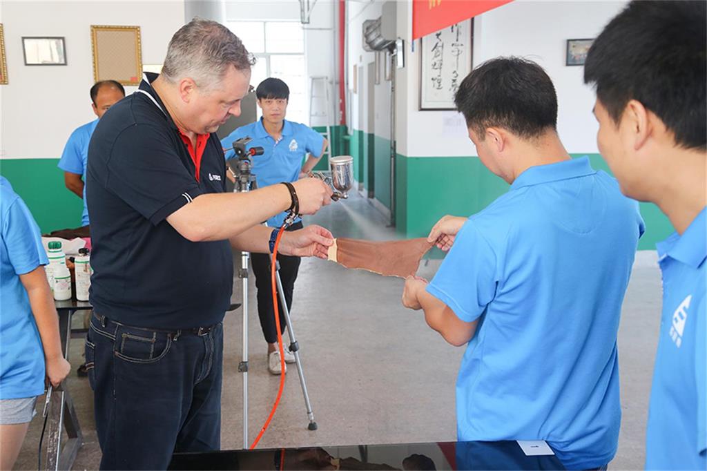 活动期间,意大利芬尼斯公司技术总监Andrew(安局)先生,亲临授课,与在场的学员和技术老师亲切互动。同时还就当前国际奢侈品流行的新趋势进行了分享。与此同时,着重推出了多款皮具修饰护理的最新工艺与产品。强调了平常工作当中最容易遇到的技术难题和解决办法,针对不同款式和颜色的皮具产品亲自进行了现场实操和演示。