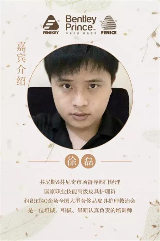 来的两天论坛将由浙江芬尼奇技术总监戴旭禹、芬尼奇宾利王子市场经理唐宏法、市场督导部门经理徐磊等专家讲师为学员进行芬尼斯皮革化工产品、奢侈品工艺的讲解和现场实操及疑难杂症救治的讲解和培训,引导学员学习实际操作与技术,充分掌握皮革护理知识、产品特性和奢侈品皮具护理、修饰保养工艺技术,共同分享奢侈品救治、保养护理等方面的成果与经验。还特别介绍了芬尼奇日化洗护品牌宾利王子,中美合资,无毒无害无污染 ,无磷无荧光剂成分,洁净又安全的新时代洗护品牌。